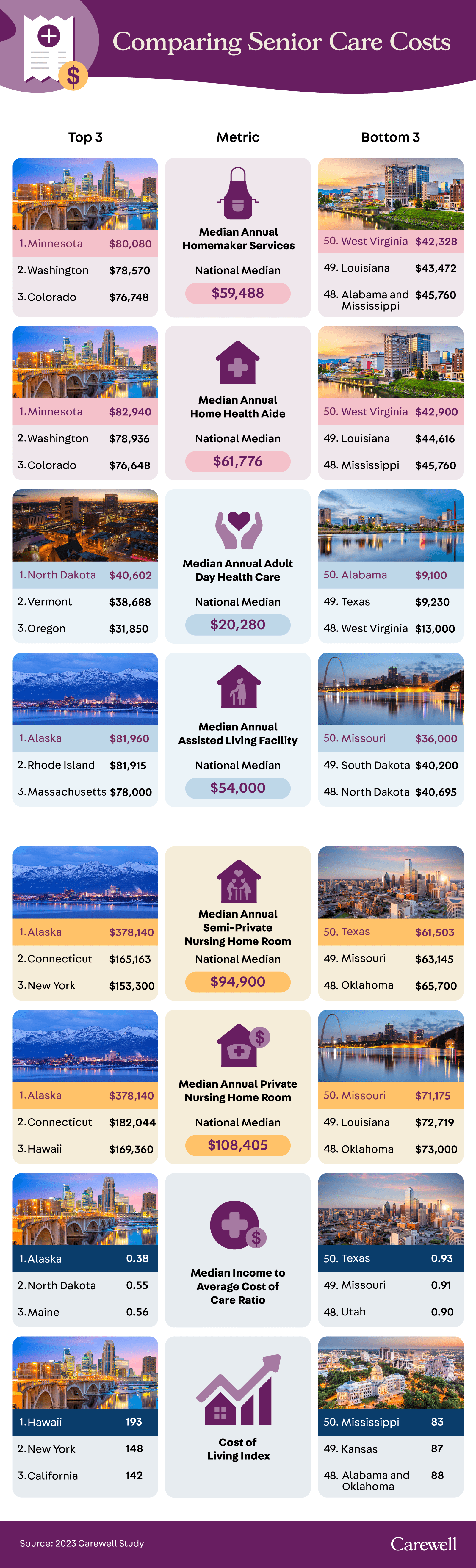With exorbitant nursing home costs, Alaska emerged as the most expensive state for senior care. An expensive place to live in general, Alaska’s cost of living is 30% higher than the national average. Still, the state’s average income to cost of care ratio was the worst in the nation, emphasizing the challenges seniors and their families face in affording necessary care.