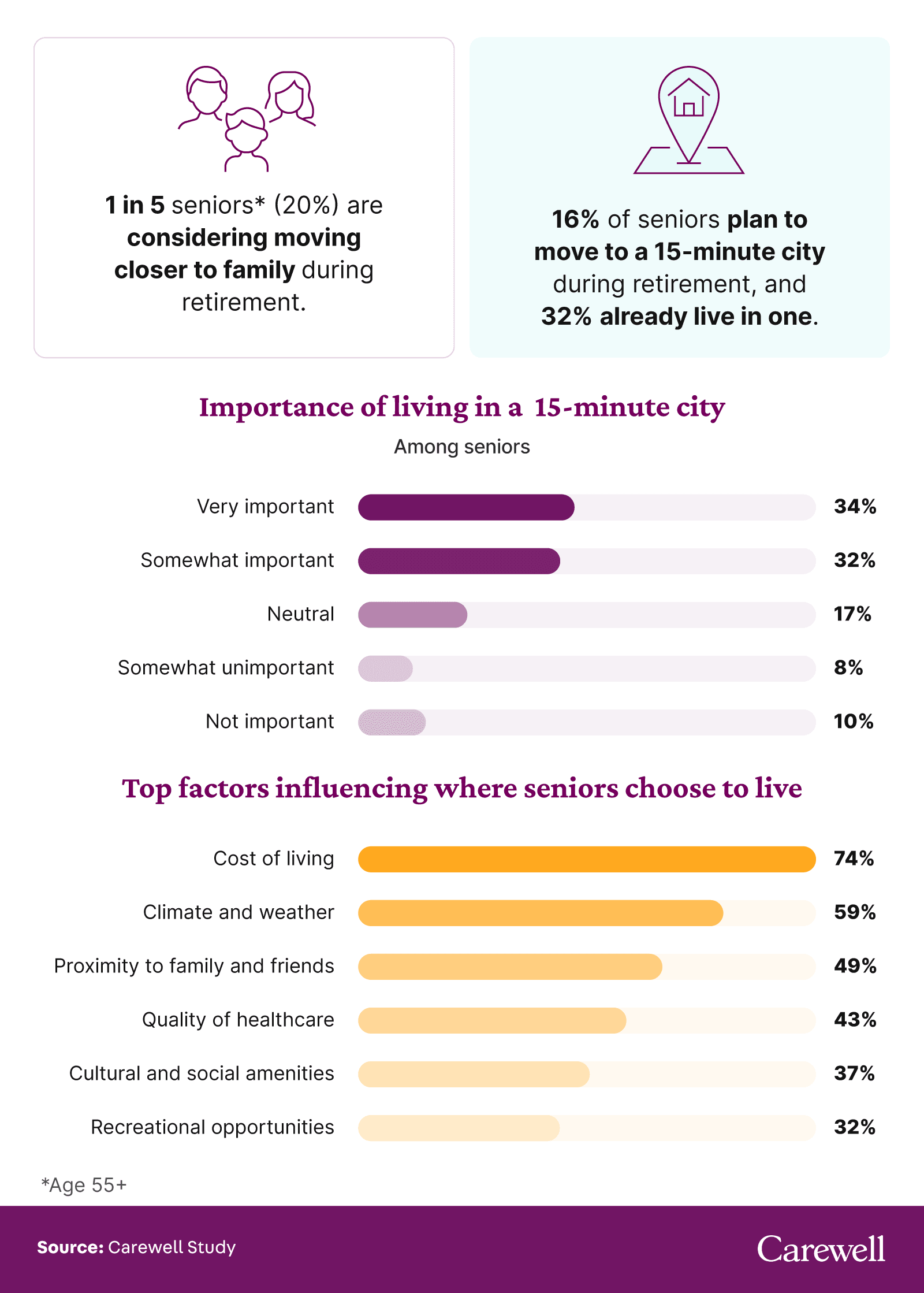 16% of seniors plan to move to a 15-minute city during retirement, and 32% already live in one.