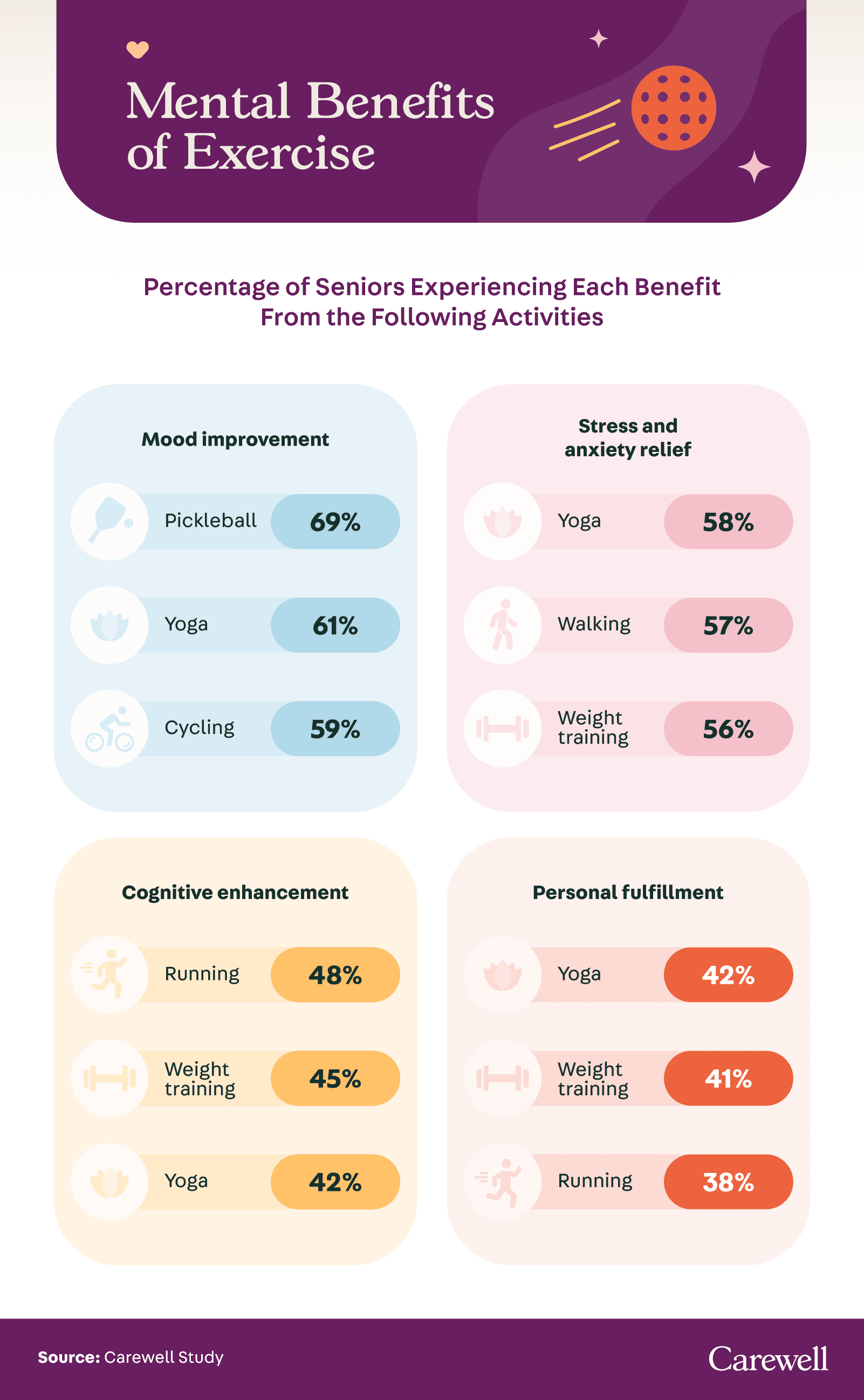 Pickleball, yoga, and cycling topped seniors’ list of mood boosters, while they favored yoga, walking, and weight training for reducing stress and anxiety. Notably, running, weight training, and yoga have enhanced their cognition while fostering personal fulfillment. It’s no wonder 70% of seniors regarded fitness as a critical component for their long-term well-being and independence, emphasizing its significance beyond physical health.