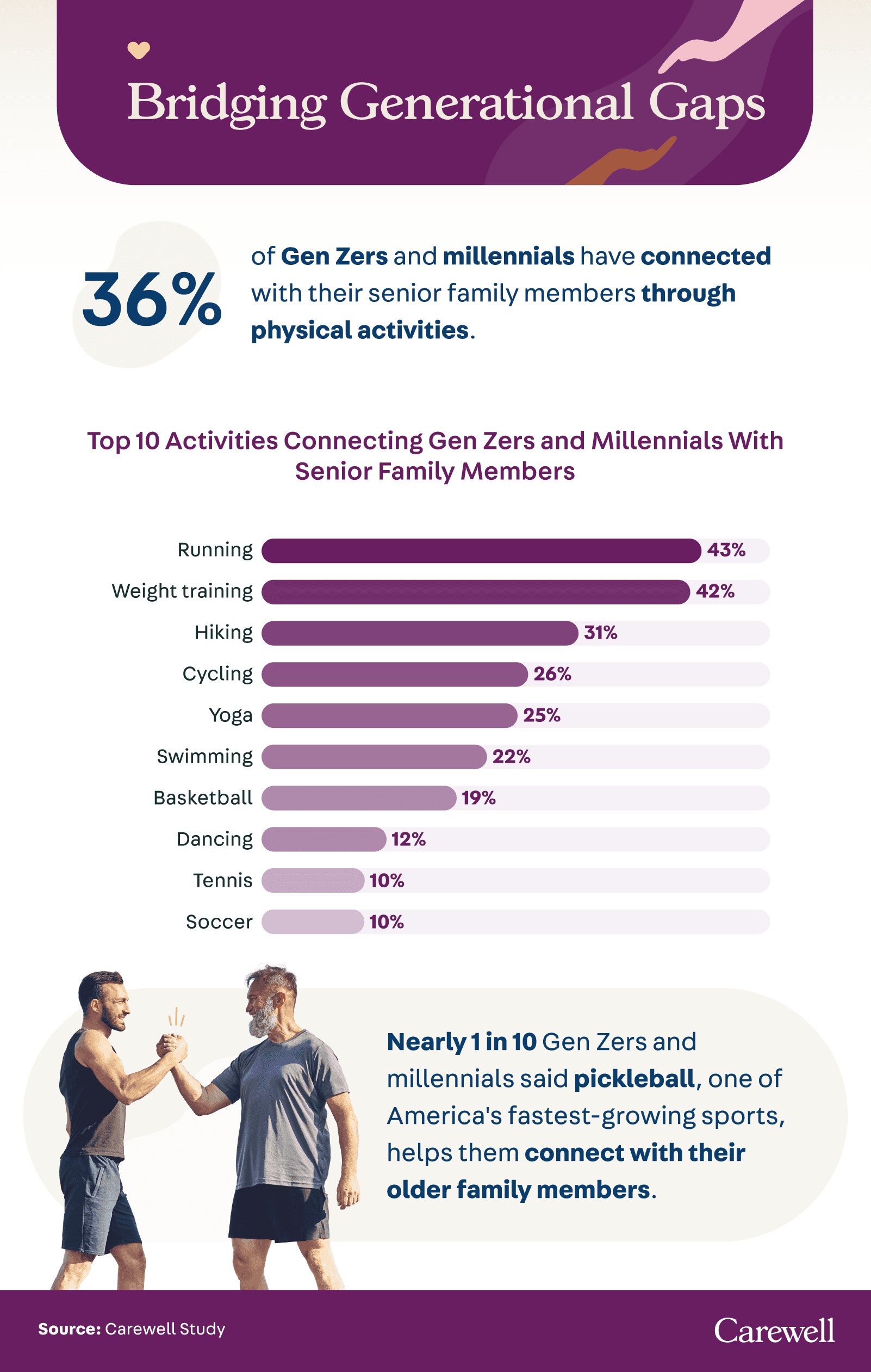 These younger generations have chosen a variety of activities to stay connected with their senior loved ones. Running led the pack with 43%, followed closely by weight training at 42%, demonstrating a commitment to shared activities and health goals. Hiking, cycling, and yoga were also popular, each with its unique appeal, while swimming, basketball, dancing, tennis, and soccer completed the top 10.