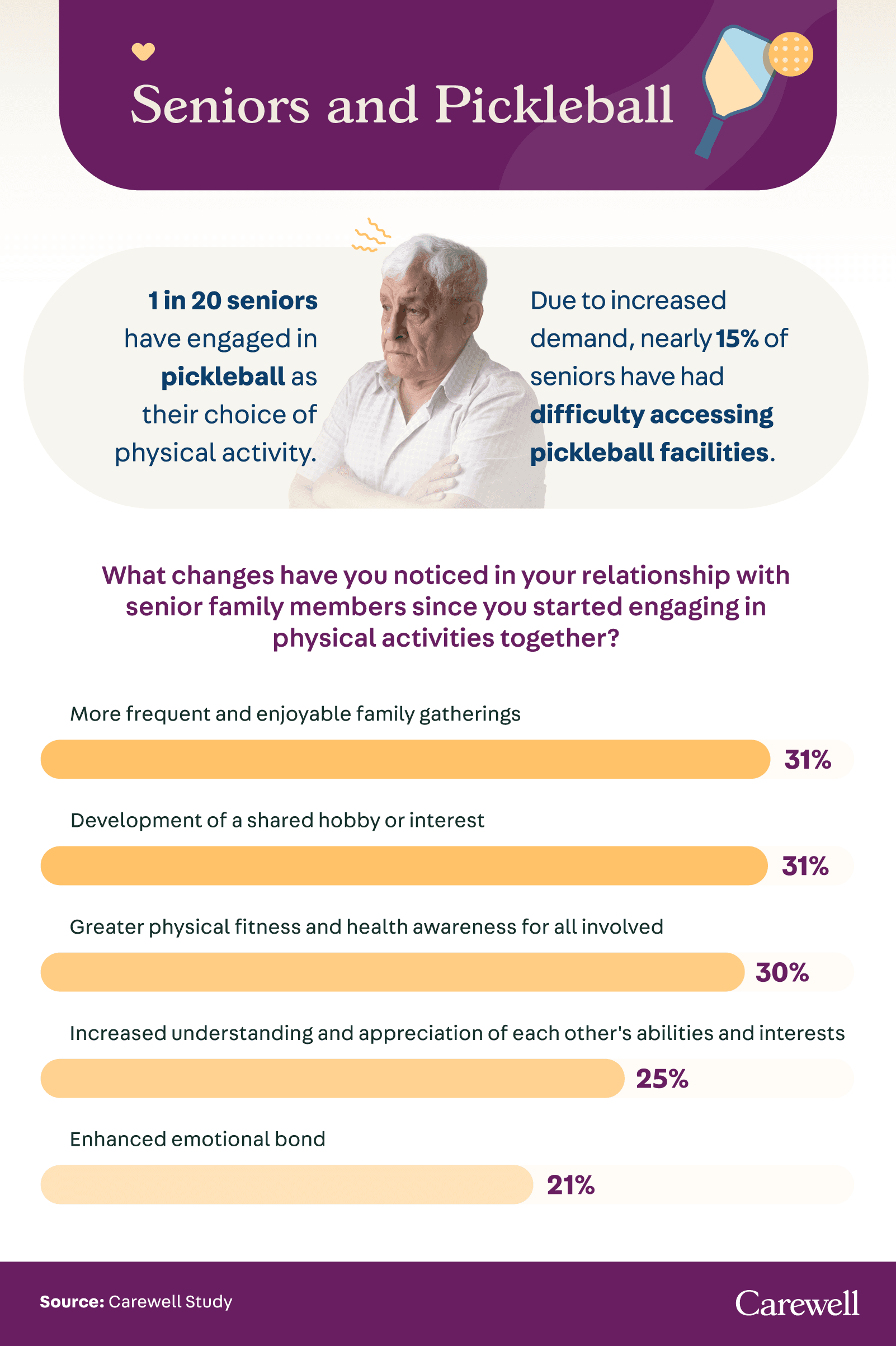 Notably, 42% of seniors observed a decrease in stress and anxiety, while 36% experienced enhanced cognition and increased self-esteem after playing pickleball. These profound impacts suggest that pickleball could improve seniors’ mental well-being and strengthen family bonds.