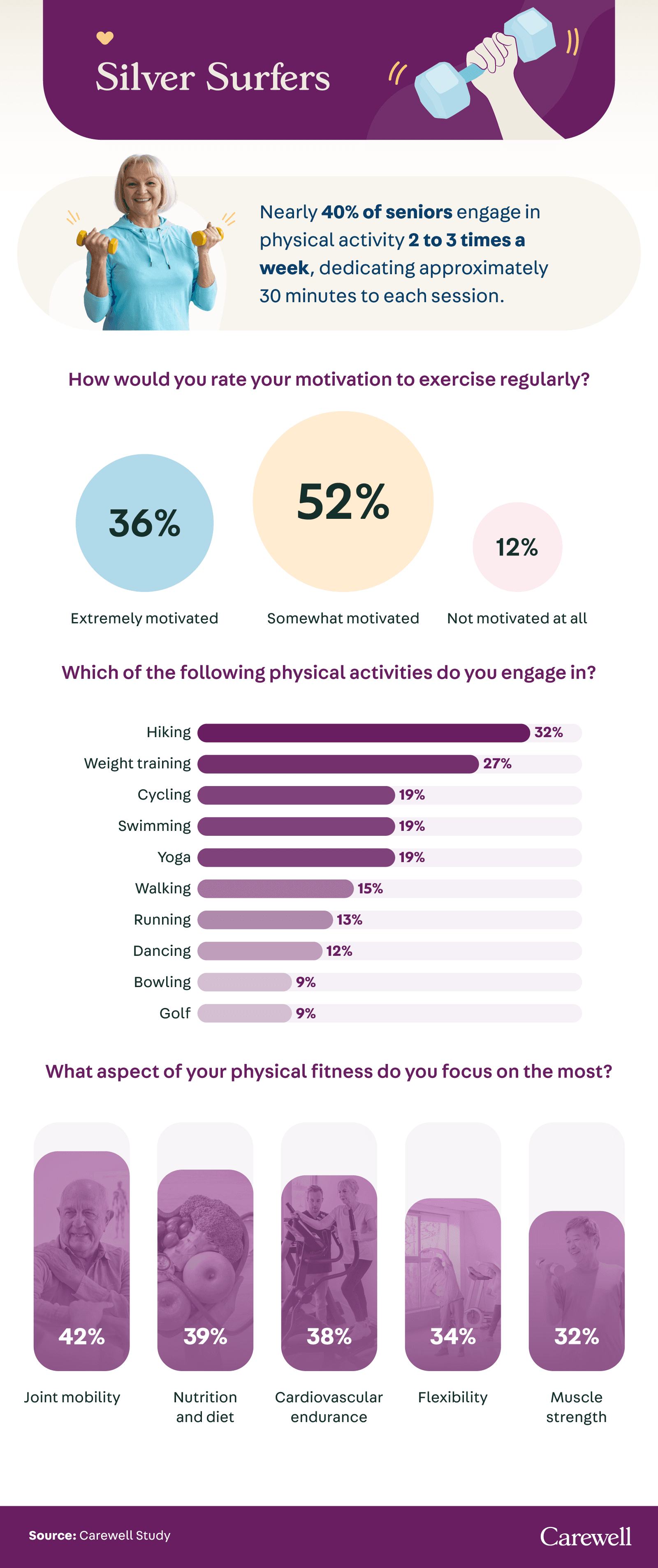 Carewell surveyed 800 seniors aged 55+ and 200 younger Americans to investigate their various fitness routines and to examine how these activities interact with and influence their family dynamics. The average age of senior respondents was 60, with a generational representation of 51% baby boomers and 49% Gen X and a gender breakdown of 38% male, 61% female, and 1% nonbinary. The average age of younger respondents was 40, with a generational representation of 84% millennials and 16% Gen Z and a gender breakdown of 54% male, 44% female, and 2% nonbinary.