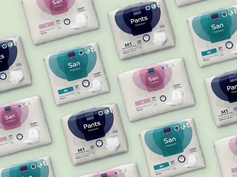 Products offered by Abena include: Tab-style briefs, pull-up underwear, bladder pads, bowel pads, booster pads, and male guards.