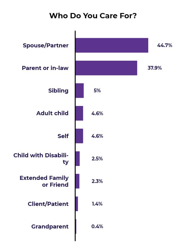 Most family caregivers provide assistance to a spouse or partner (44.7%), or their parents or in-laws. (37.9%). The other 17.4% care for an adult child, a child with a disability, a sibling, an extended family member, or a friend.