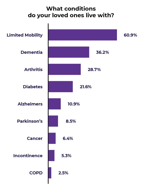 Many care recipients need help with activities of daily living (ADLs) like eating, getting dressed, and using the toilet. Our family caregiver survey reflects that information, with 60.9% of respondents saying they take care of someone with limited mobility. Other common medical conditions that require regular assistance include dementia, arthritis, and diabetes.