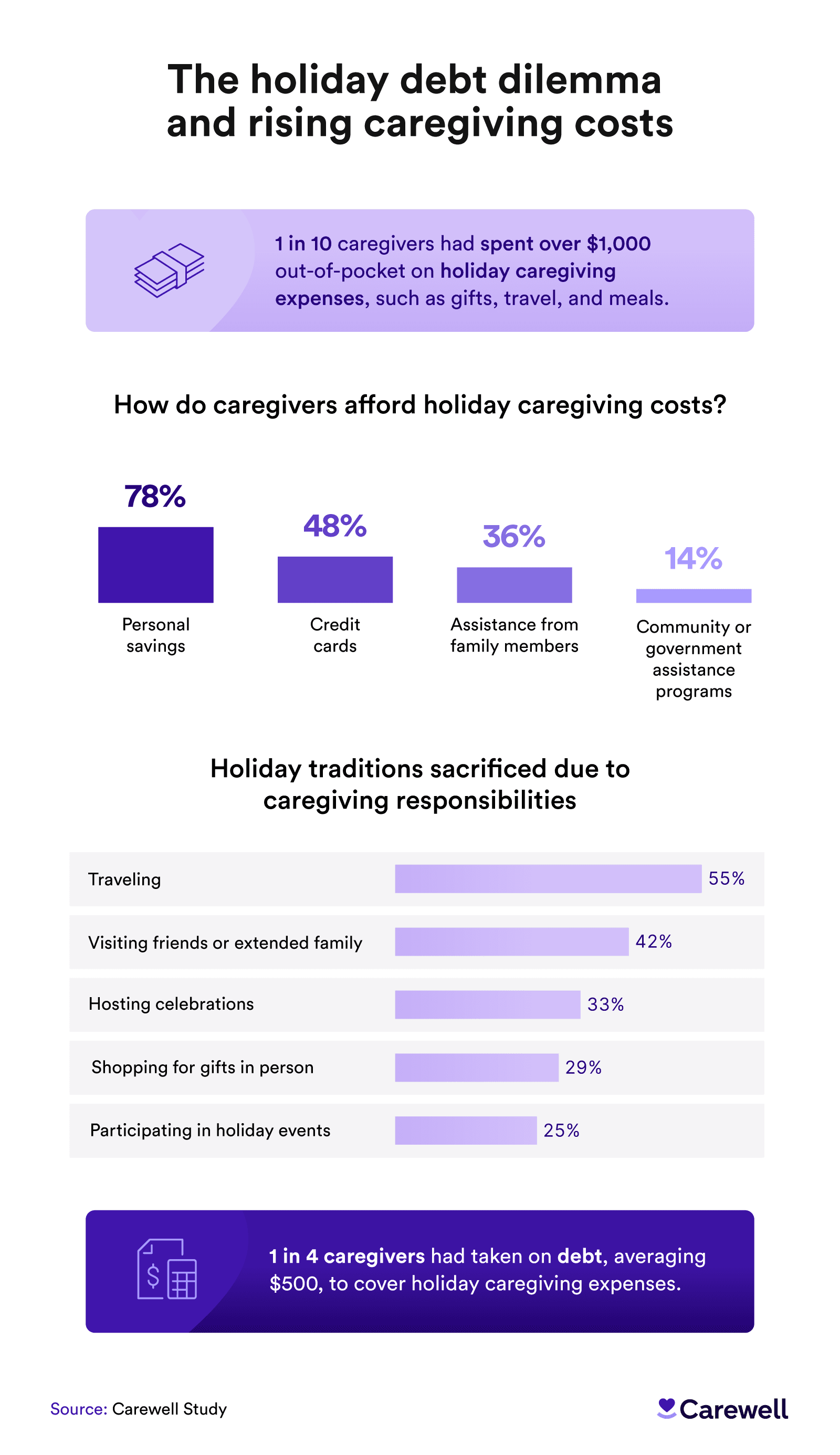 1 in 4 caregivers has taken on an average of $500 in debt to cover holiday-related caregiving expenses.