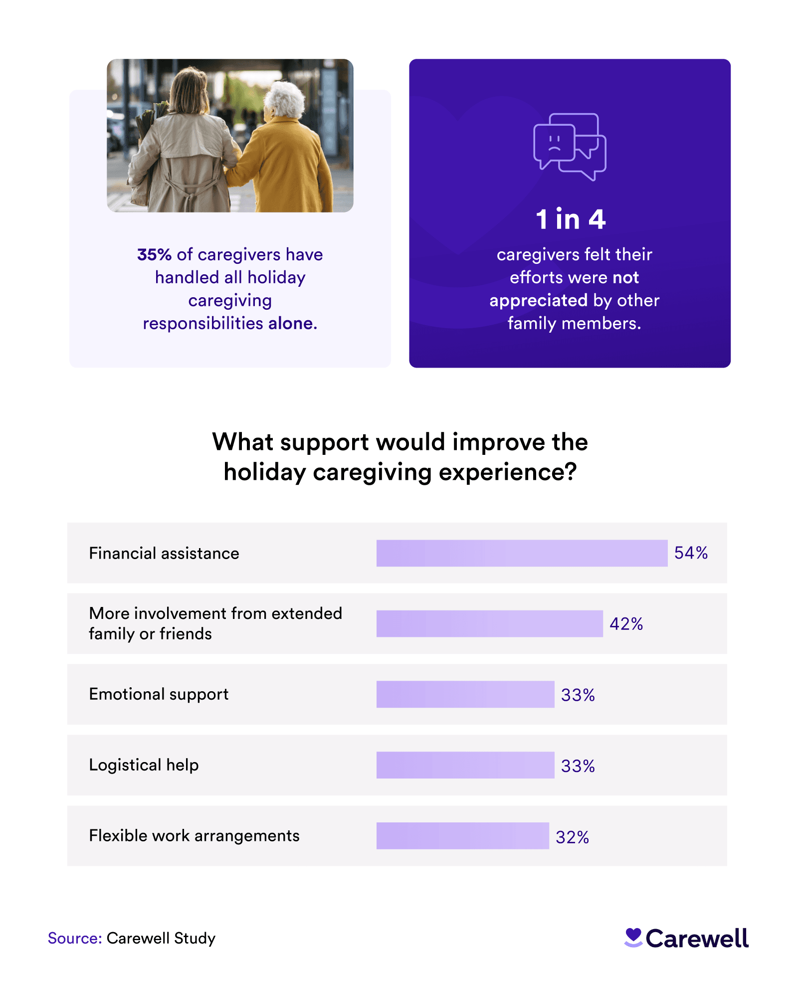 Isolation is another significant challenge. Over a third of caregivers (35%) reported handling all holiday caregiving duties alone, including 33% of Gen Z caregivers. This lack of support left some caregivers feeling unappreciated: 1 in 4 Gen Z felt their efforts went unnoticed by their families, adding to the emotional toll of holiday caregiving.