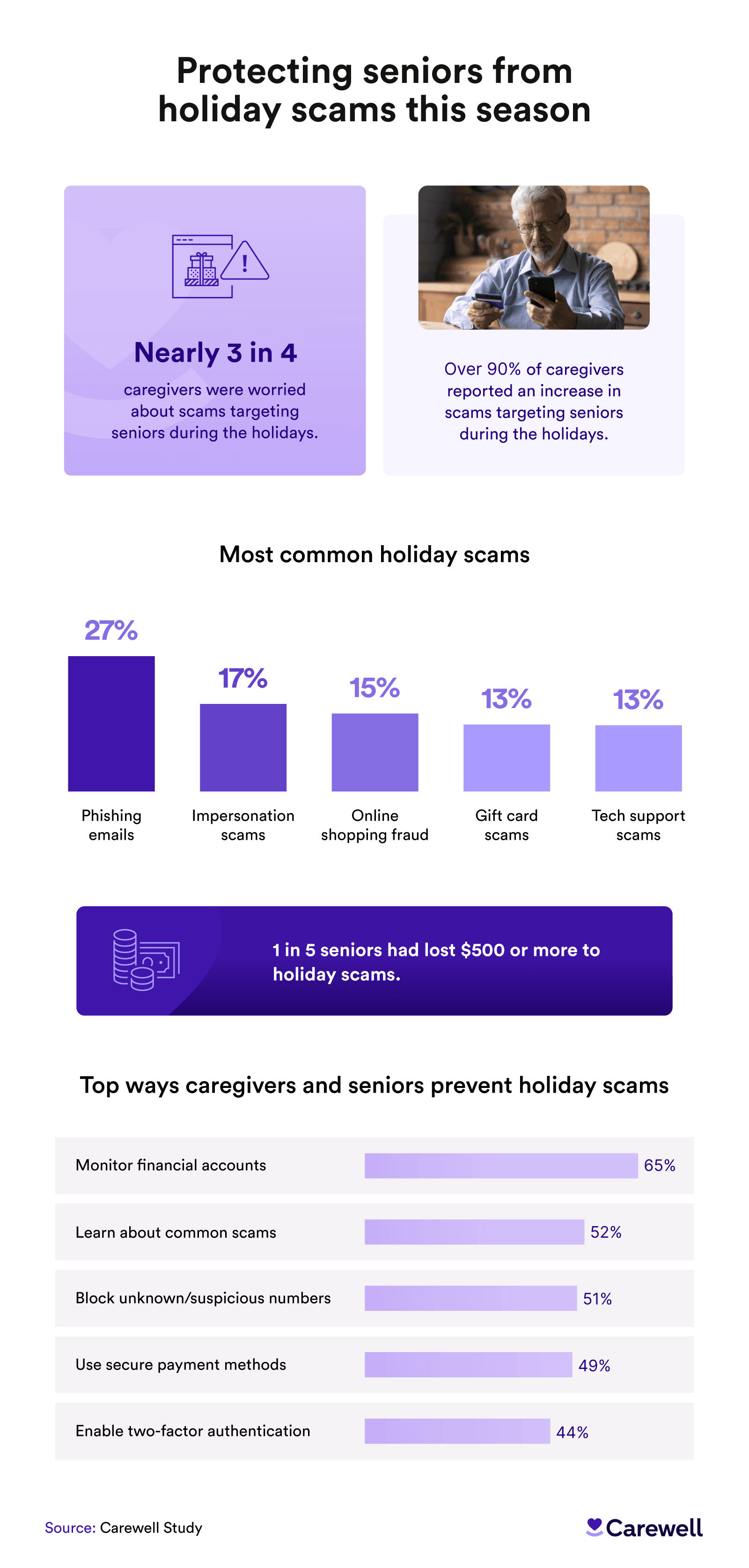Nearly 3 in 4 caregivers expressed worry about scams targeting seniors during the holidays, a concern fueled by the fact that over 90% reported an increase in such scams during this time of year. Senior-targeted scams are not only pervasive but also costly — 1 in 5 seniors said they had lost $500 or more to holiday scams.
