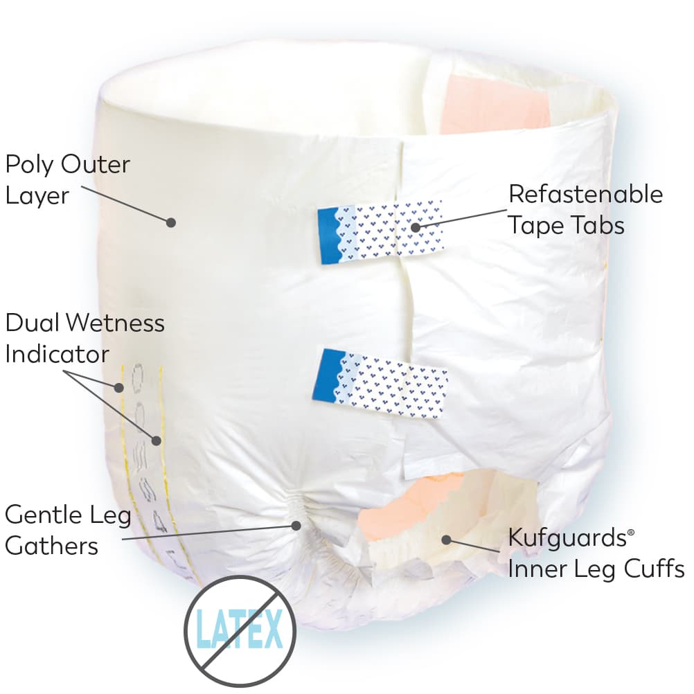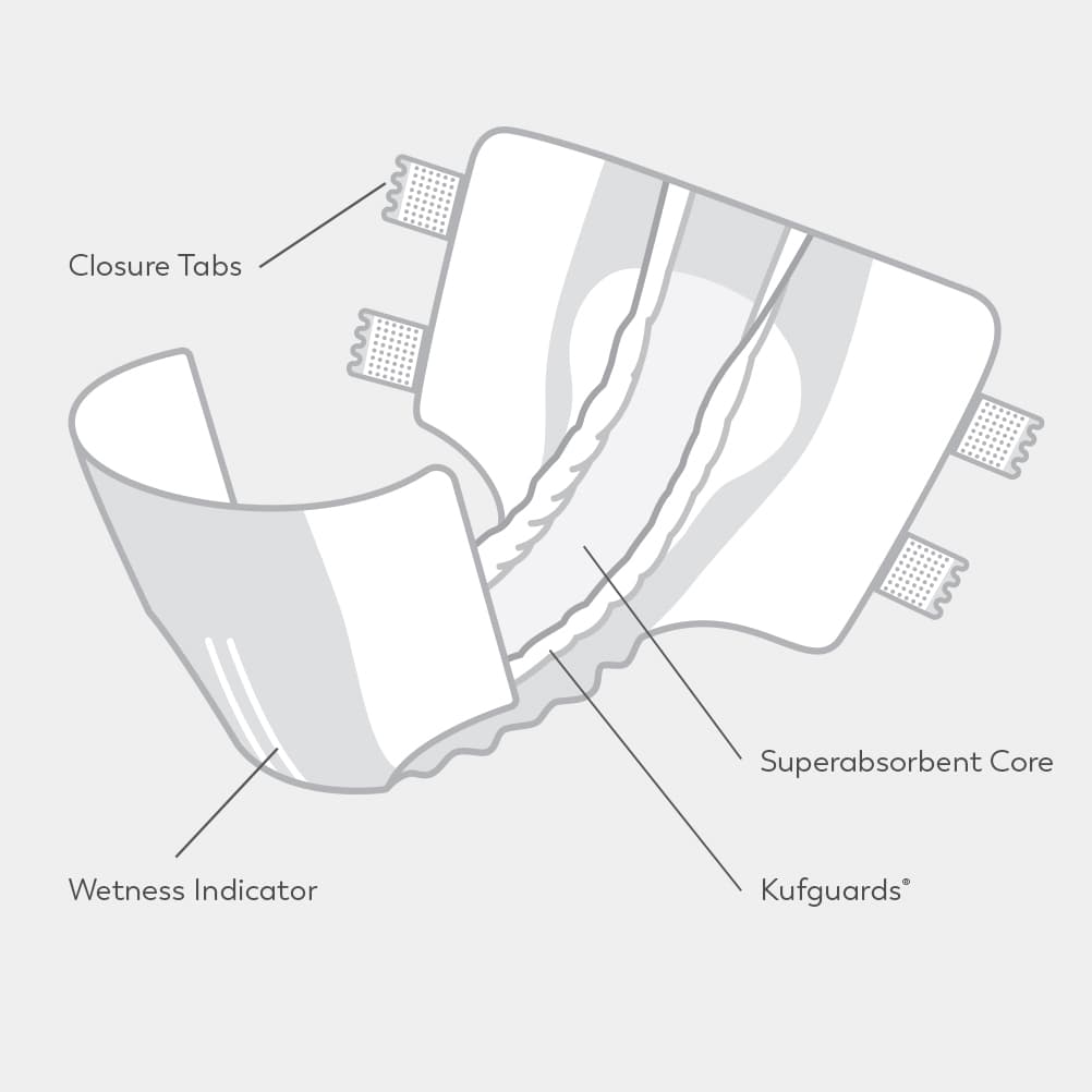 Kufguards® are inner leg cuffs that channel fluids to the superabsorbent core of the brief. This design is crucial for containing leaks and messes, especially for those who toss and turn or lie on their side during the night. These discreet inner leg cuffs provide an extra layer of protection, ensuring you stay dry and confident, even with heavy urinary or bowel incontinence.